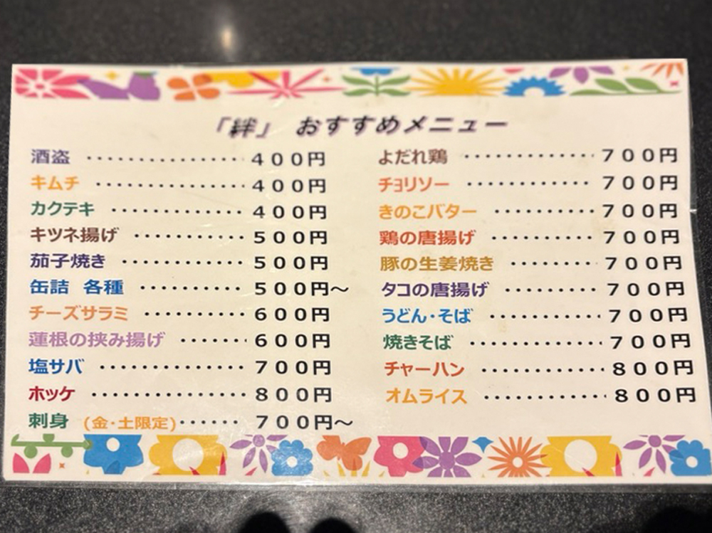 旭町にある“居酒屋 絆”は、18時〜翌5時頃まで営業(早仕舞い有り)しているお店。中が見えないので入るのに躊躇してしまいそうだが、入ってみれば優しいママのたまちゃんが迎えてくれるので安心。様子を見ながら声を掛けてくれるので、一人で静かに飲みたい人でも問題なしです。